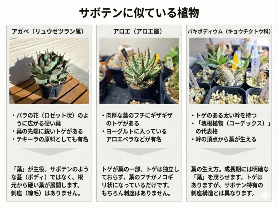 それぞれの特徴と、サボテンとの違いを以下の表にまとめました。