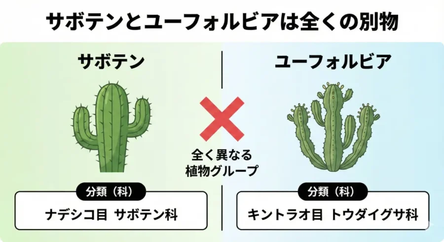 これらは見た目がサボテンに瓜二つですが、分類学上は全くの赤の他人に当たります。