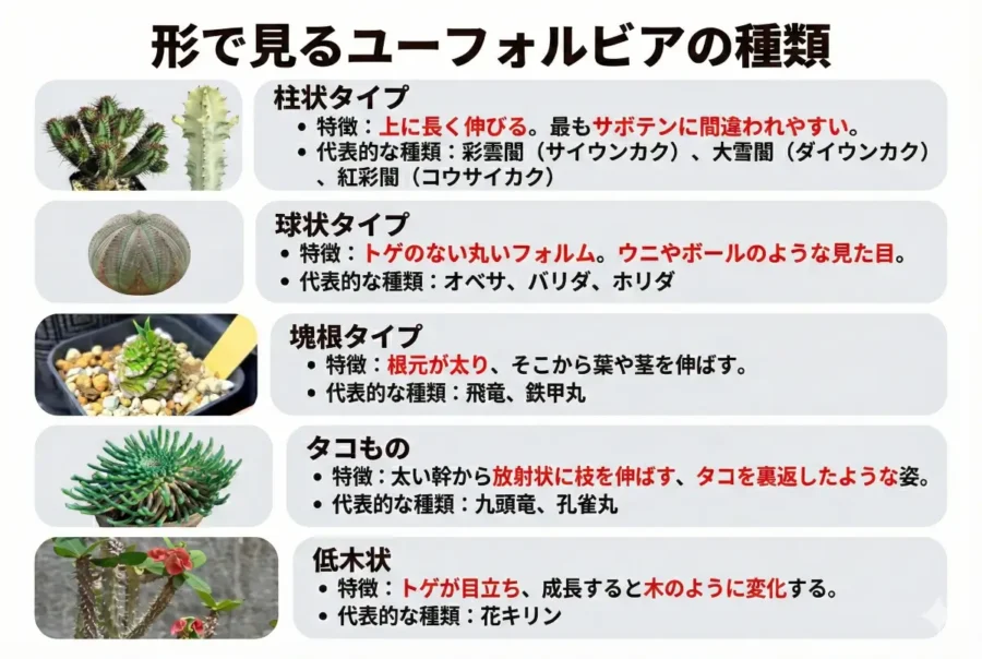 ユーフォルビアは形のデパートと言えるほど種類が豊富ですが、特にサボテンと間違われやすい5つのタイプを紹介します。