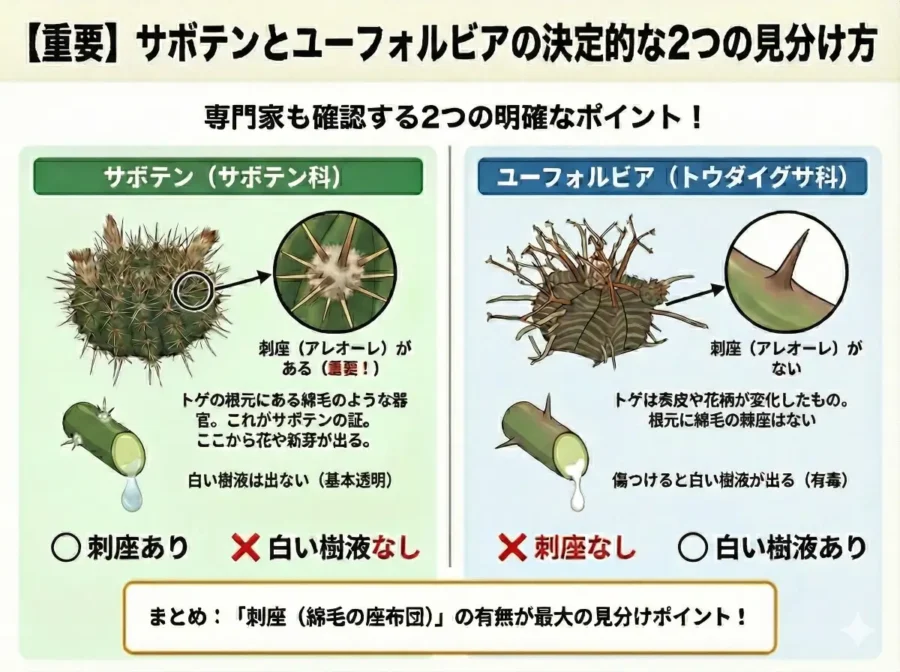 では、目の前の植物が「サボテン」なのか「ユーフォルビア(または他の多肉植物)」なのか、どうやって判断すればよいのでしょうか?